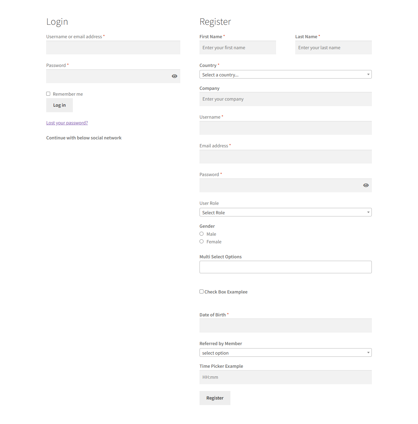 Add unlimited custom fields to your WooCommerce registration page using 17 different field types, including: