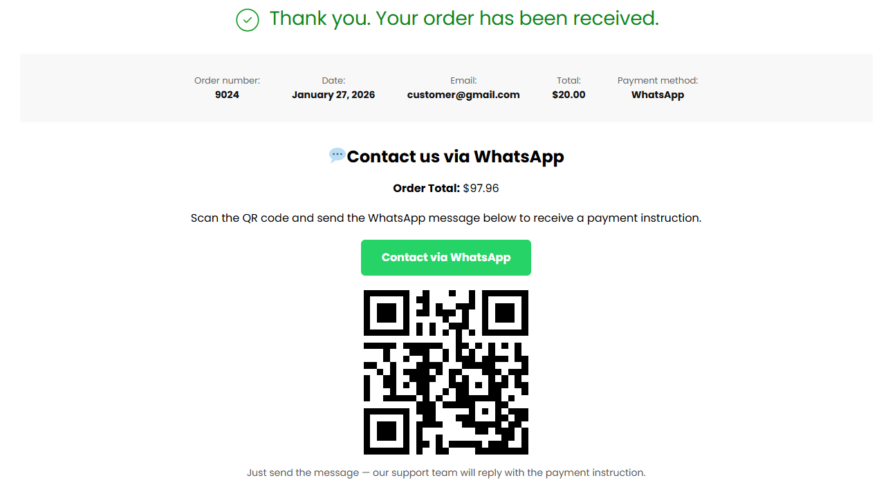 Instead of processing payments automatically, this plugin creates a guided, chat-based checkout flow. After placing an order, customers receive clear instructions along with QR codes and direct contact buttons on the Thank You page. The same instructions are also sent by email, including full order details, so customers can quickly reach your support team and complete the order.
